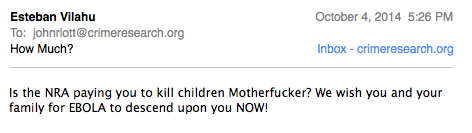 At 2:25 into the interview, Stossel mentions again how the Bloomberg people were unwilling to appear on the program when they knew that Lott was participating. Normally when gun control advocates refuse to debate Lott he is replaced with someone else or the gun control people go on by themselves. But in this case Dr. Lott’s son was the producer for this show.