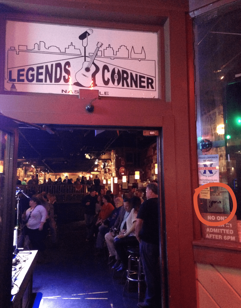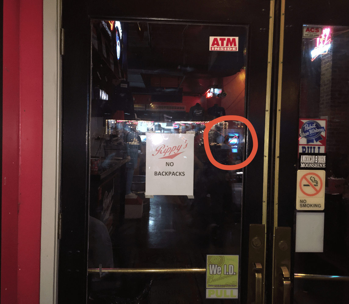 Robert’s — Instead of a sign indicating that permitted concealed handguns are banned, this bar has two NRA decals at the front — 416B Broadway, Nashville, TN 37203.