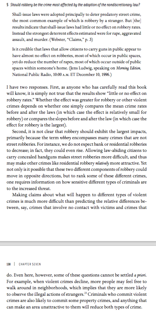 I have a long discussion about why purely cross-sectional analysis is unreliable. Regarding: “zip codes with the highest violent crime before Texas passed its concealed carry law had the smallest number of new permits issued per capita.” Well, given that it cost $140 and 10 hours of training to get a permit, it isn’t very surprising to me that poor areas have both high crime rates and low permit rates. As to cherry-picking, even if cross-sectional analysis was useful, somehow the authors have to explain why they picked one city in the entire US to look at. In any case, I note this paper and respond to it in MGLC.
