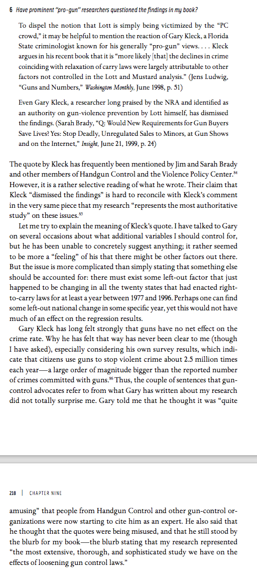 1) Note that Kleck has also said many positive things about my research. For example, see this quote: “John Lott has done the most extensive, thorough, and sophisticated study we have on the effects of loosening gun control laws. Regardless of whether one agrees with his conclusions, his work is mandatory reading for anyone who is open-minded and serious about the gun control issue. Especially fascinating is his account of the often unscrupulous reactions to his research by gun control advocates, academic critics, and the news media.”