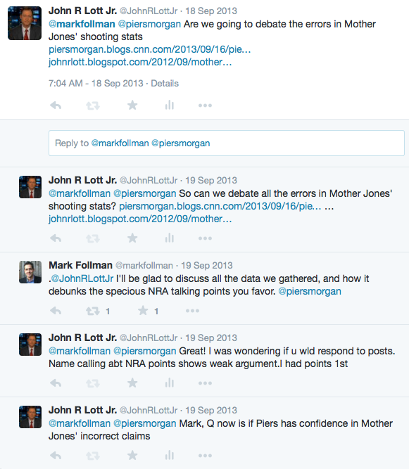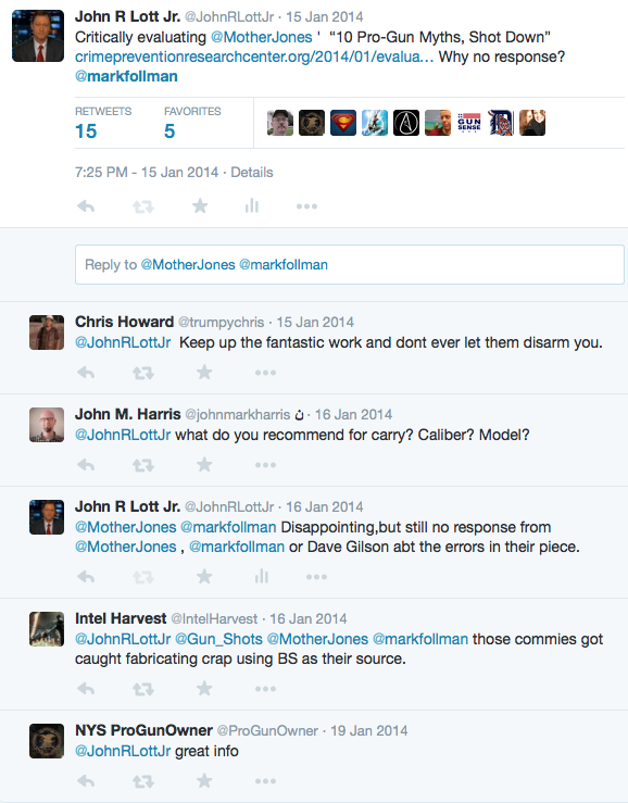This article by Mother Jones is part of pattern of similar attacks. For a decade Media Matters attacked John Lott in over a 110 posts, and they were so unwilling to discuss the claims that they made that they would systematically remove any responses that were attempted to be posted in their comment section. More recently a new group named “Armed with Reason,” which has connections to Bloomberg’s gun control groups, rehashed old comments, but completely ignored the academic responses that Lott had already published. A more productive approach would have been to explain why Lott’s responses were wrong.