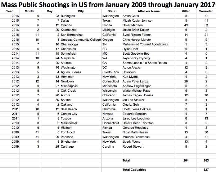 2: The number of “mass shootings” used by Mother Jones is very specifically defined and limited to mostly single shooters in a single location. That would eliminate Hebdo and the November attacks from the comparison. http://www.motherjones.com/politi…/2012/…/mass-shootings-maphttp://www.motherjones.com/politi…/2012/…/mass-shootings-map