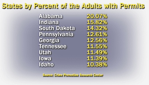 Concealed handgun permits are now held by some more than 6 percent of American adults, the CPRC analysis found. Outside the restrictive states of California and New York, that figure rises to about 8 percent.