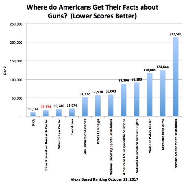 While our website has a rank of 17,174 for the US as of October 21st, amazingly Everytown was only at 21,074 despite an annual budget of around $50 million and the massively favorable news coverage they receive. Even over the entire world, we are generating more interest than Everytown, and we are well ahead of the Brady Campaign and Gun Owners of America. The CPRC also out does Giffords Law Center (formerly Americans for Responsible Solutions) (19,740), the Second Amendment Foundation (212,581), National Shooting Sports Foundation (59,003), and Keep and Bear Arms (124,644). However, while we are ranked 17,174 in the US, the NRA is ranked at 11,141, our budget is obviously just a tiny fraction of theirs.