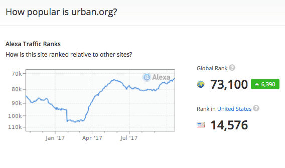 The CPRC also does extremely well compared to other think tank operations. The Urban Institute with a staff of about 450 people is more successful in its US ranking 14,576, but we are well ahead of them in our worldwide ranking since they are at 73,100. The Center for American Progress with a budget of $10 million ranks at just 51,031 in the US, Competitive Enterprise Institute with a budget of over $7.4 million ranks at 83,457, Heartland Institute at 81,042, the Manhattan-Institute at 101,710, and the Family Research Council at 33, 385.