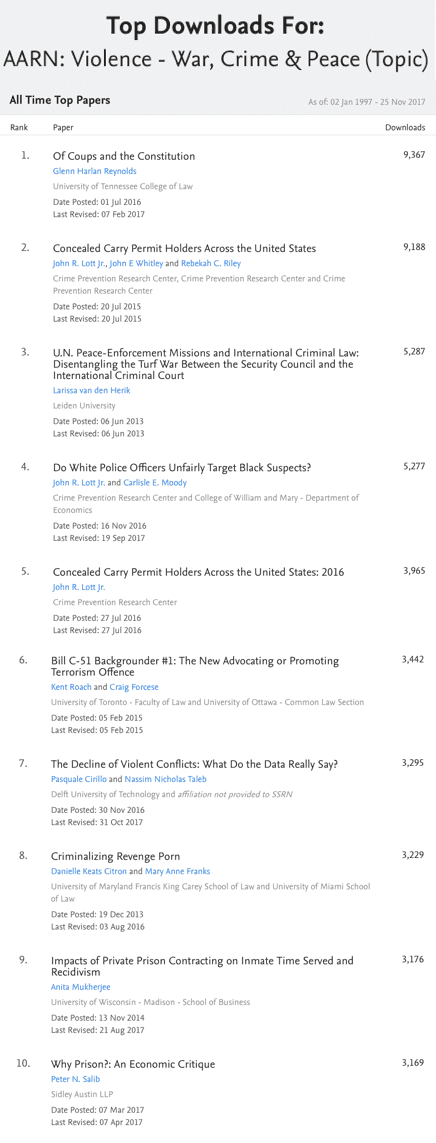 For the subject category of Violence & Crime (click here if you want to download the papers), the CPRC has the top three most downloaded studies, four of the top eight.  All four of our papers here were written within since 2015.  The lists of the different categories are shown below.  When we last looked at these rankings, the CPRC only had three of the top for papers.