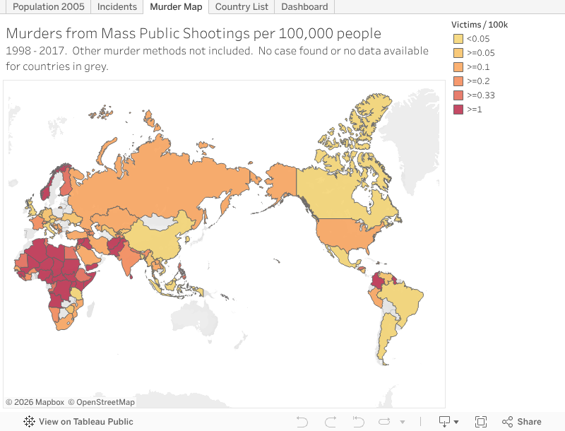 There are 61 countries with higher murder rates from these mass public shootings. This includes Russia, Norway, Finland, and Switzerland, with rates that are all at least 45% higher than the US rate. While some of these are war zones, most of them are not, right?