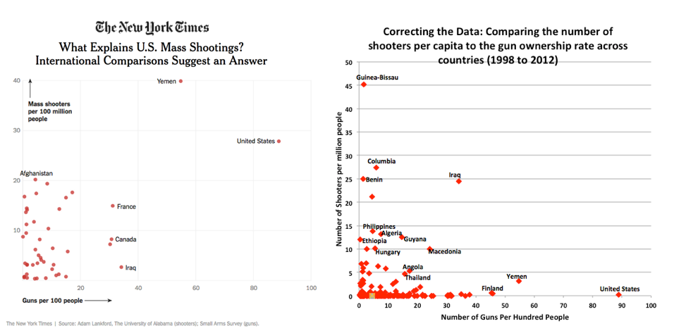 Here is a graph that the New York Times put together using Lankford’s data (data on the rate of mass public shooters by country that has not been released to anyone other than the New York Times) and our graph using the corrected data. While the graph with Lankford’s data shows a positive relationship between the rate of mass public shooters and Small Arms Survey measure of gun ownership (it appears to be driven by the outliers of Yemen and the US), our graph implies a slightly negative relationship. Click on Figures to enlarge.