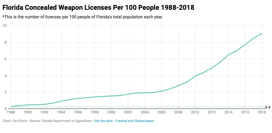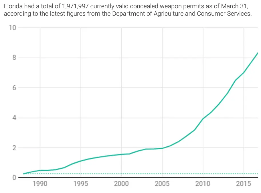 Florida: had 1,919,024 on May 31, 2018 and that increased to 2,010,869 by May 31, 2019. Revocation of permits in Florida is available here(07012018_06302019_cw_annual). Florida demographics available here.