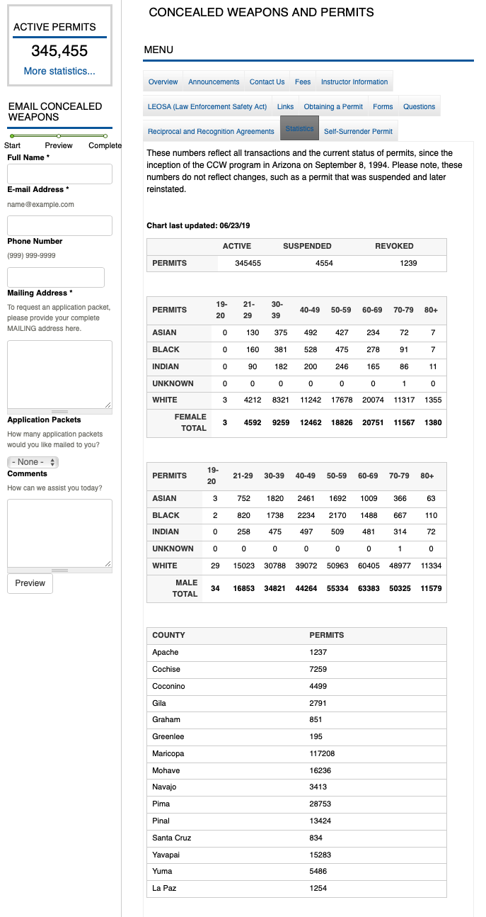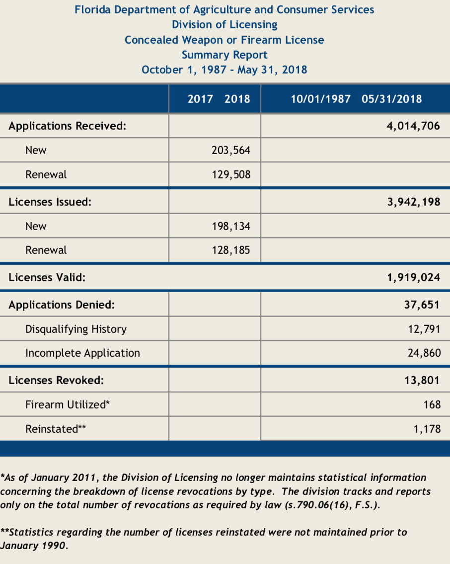 Florida: had 1,919,024 on May 31, 2018 and that increased to 2,010,869 by May 31, 2019. Revocation of permits in Florida is available here(07012018_06302019_cw_annual). Florida demographics available here.