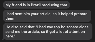 Tucker Carlson interviews Eduardo Bolsonaro, adviser to his father, President Jair Bolsonaro, about Brazil’s gun policies on ‘Tucker Carlson Tonight.’ The numbers and discussion in the interview are clearly based on the Wall Street Journal op-ed that Dr. John Lott had the day before. Below is a text message that shows that President Bolsonaro’s aides made sure that Tucker’s producer was aware of the op-ed.