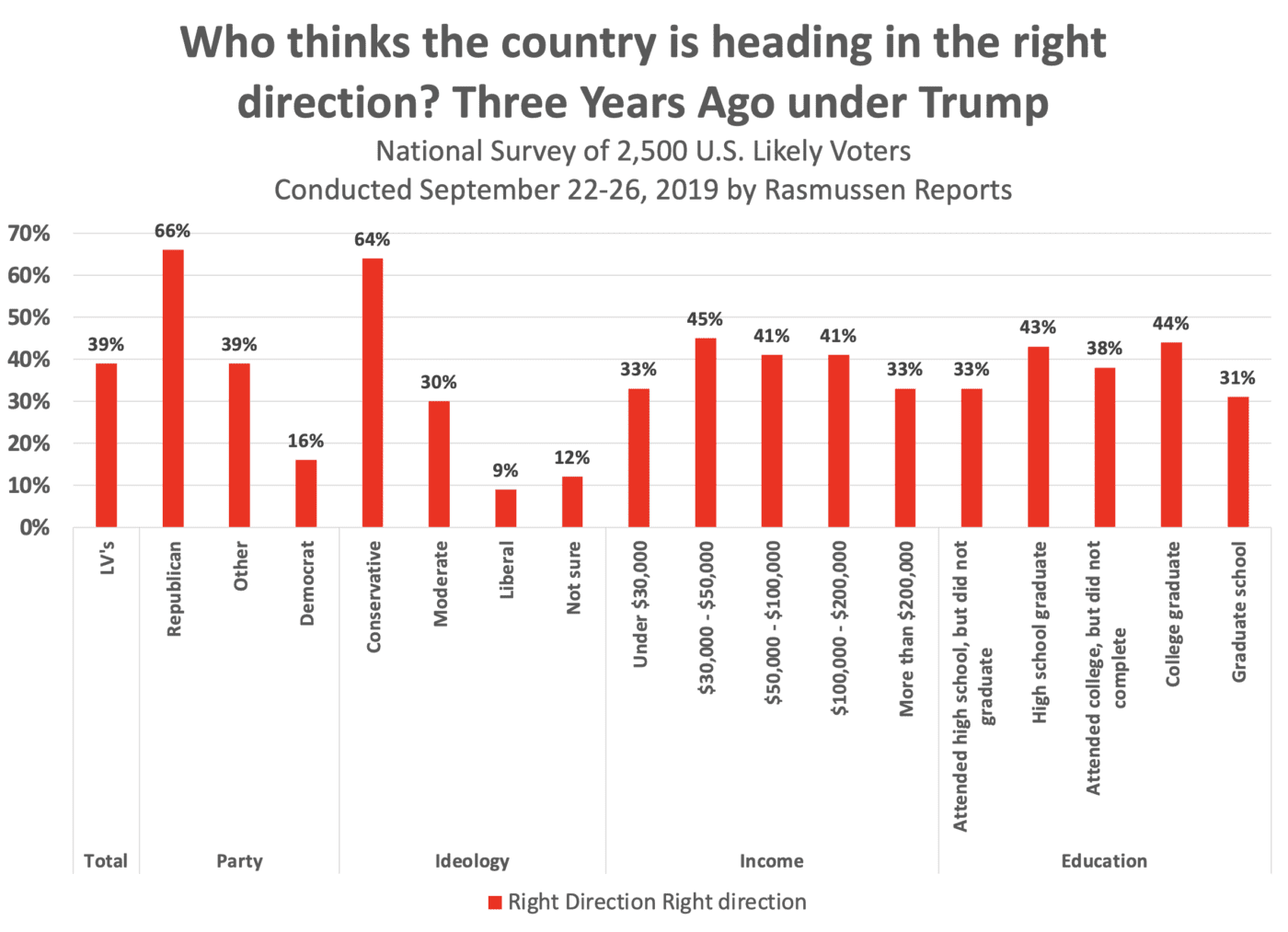 So we looked at the same survey by Rasmussen three years ago when Trump was president. Under Trump, those with graduate educations were the least happy about the direction of the country and the highest income people were tied with the very lowest as being the least optimistic about the future.