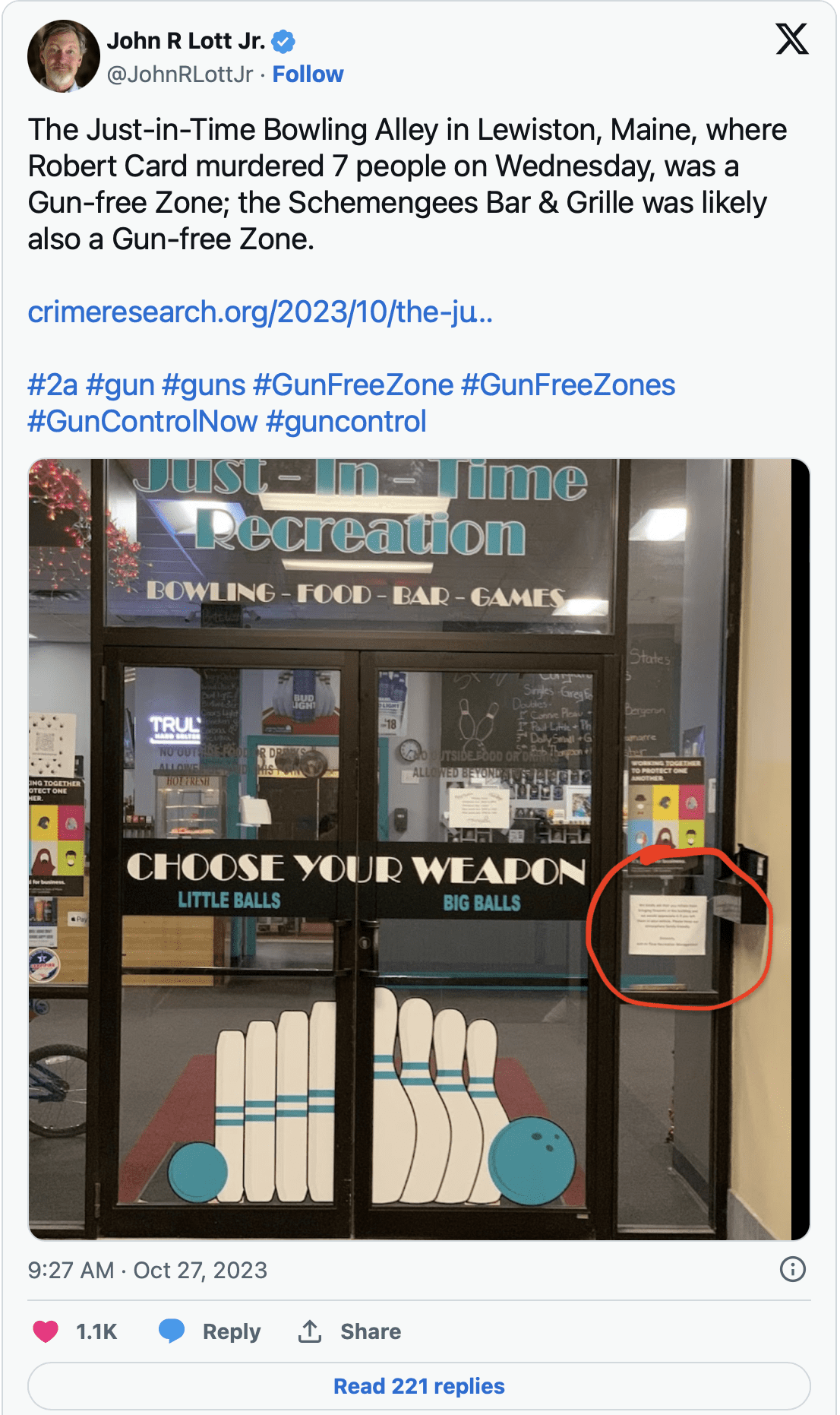 The sign for Just-in-Time Bowling Alley, located at 24 Mollison Way, Lewiston, ME 04240, reads: “We kindly ask that you refrain from bringing firearms in this building and we would appreciate it if you left them in your vehicle. Please keep our atmosphere family friendly.” Card murdered seven people (one woman and six men) there. We are working to get a higher-definition picture of the sign.