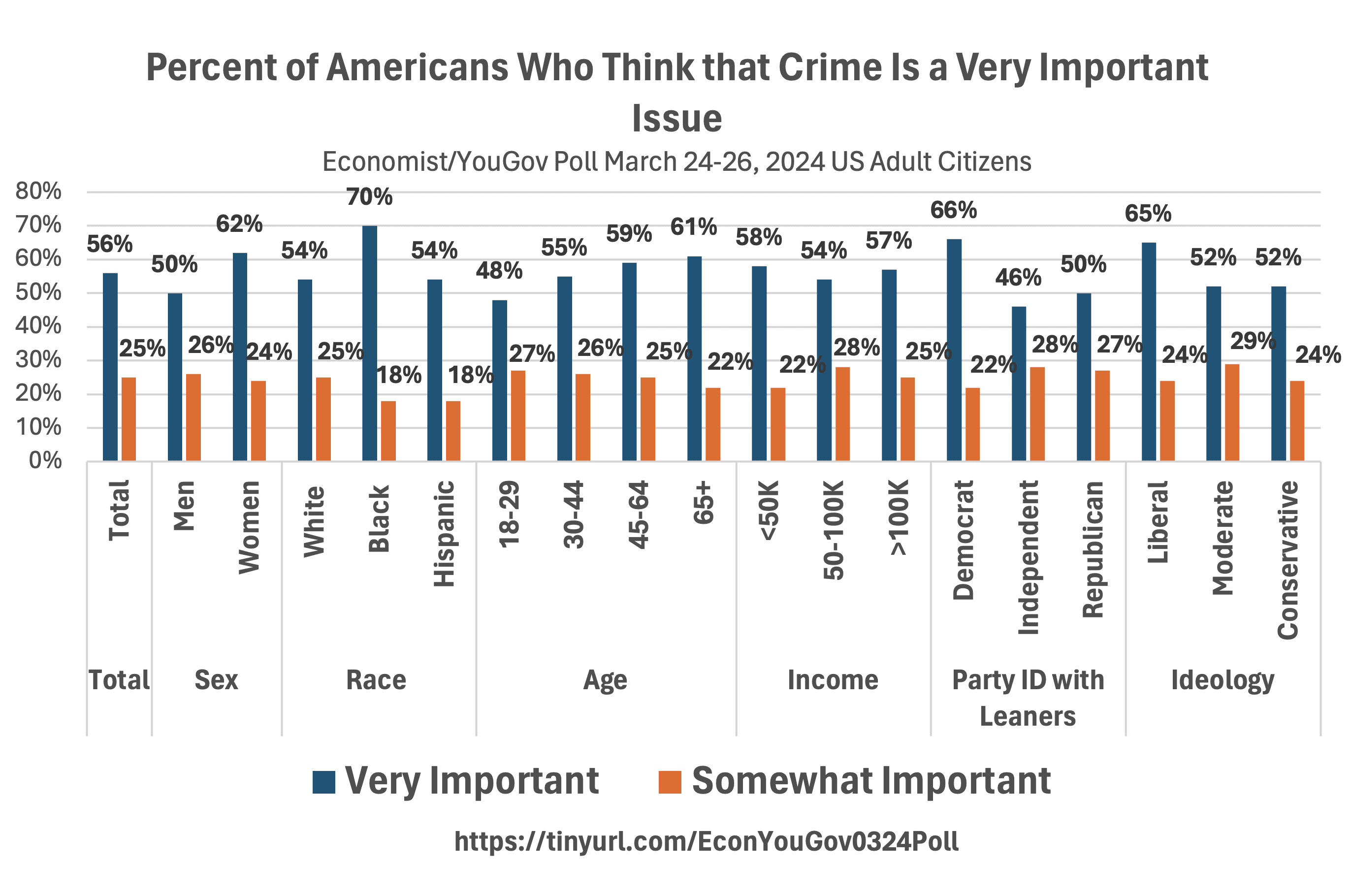 Asking whether “guns” are an important issue for Americans is not particularly useful as both those concerned about the right to self-defense and gun control advocates may both answer yes. While a new Economist/YouGov poll (p. 36) from March 24-26, 2024 has guns and civil rights tied at 6% of USA adults saying that it is the most important issue facing the country, a range of other issues (taxes and government spending, abortion, and national security) come in at a very close 5%. The fact that both those concerned about the right to self-defense and gun control advocates will answer “yes” to this question can be seen by the very high rates that various groups with widely differing views on guns answer that it is important.