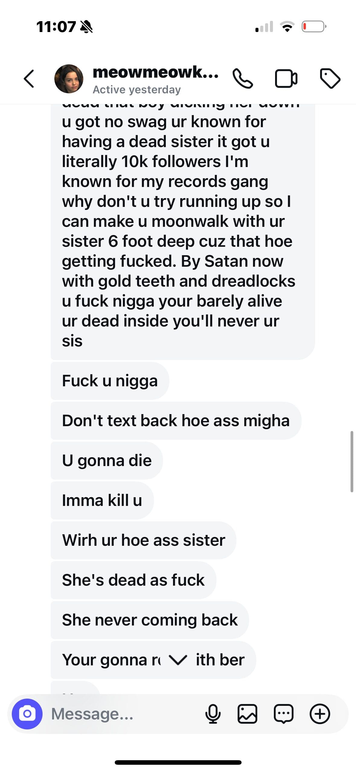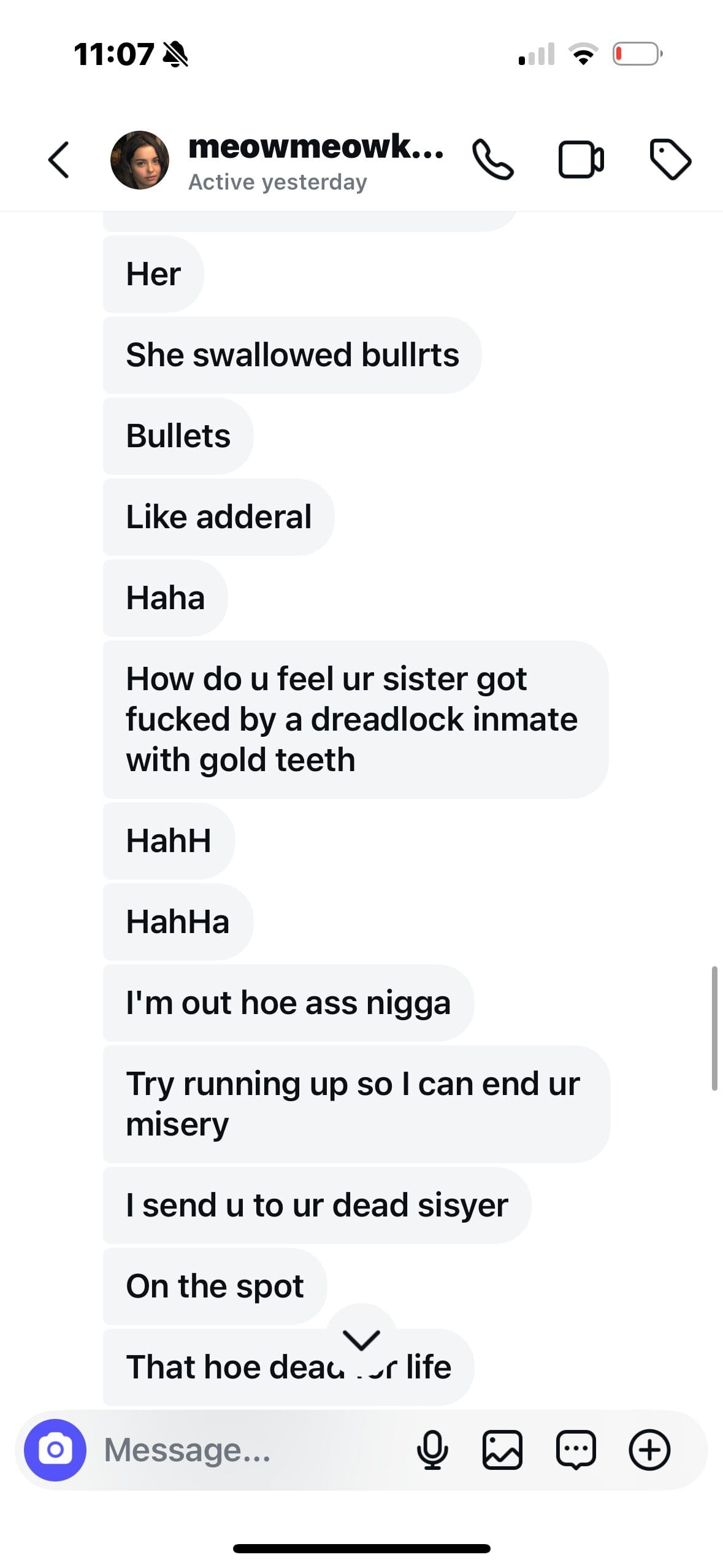 But in February, the messages escalated into direct death threats. Some of his chilling messages included: “I send u to ur dead sister,” “u gonna die,” “Imma kill you,” and “I guarantee u of Nicolas didn’t shoot her id probably kill her.”