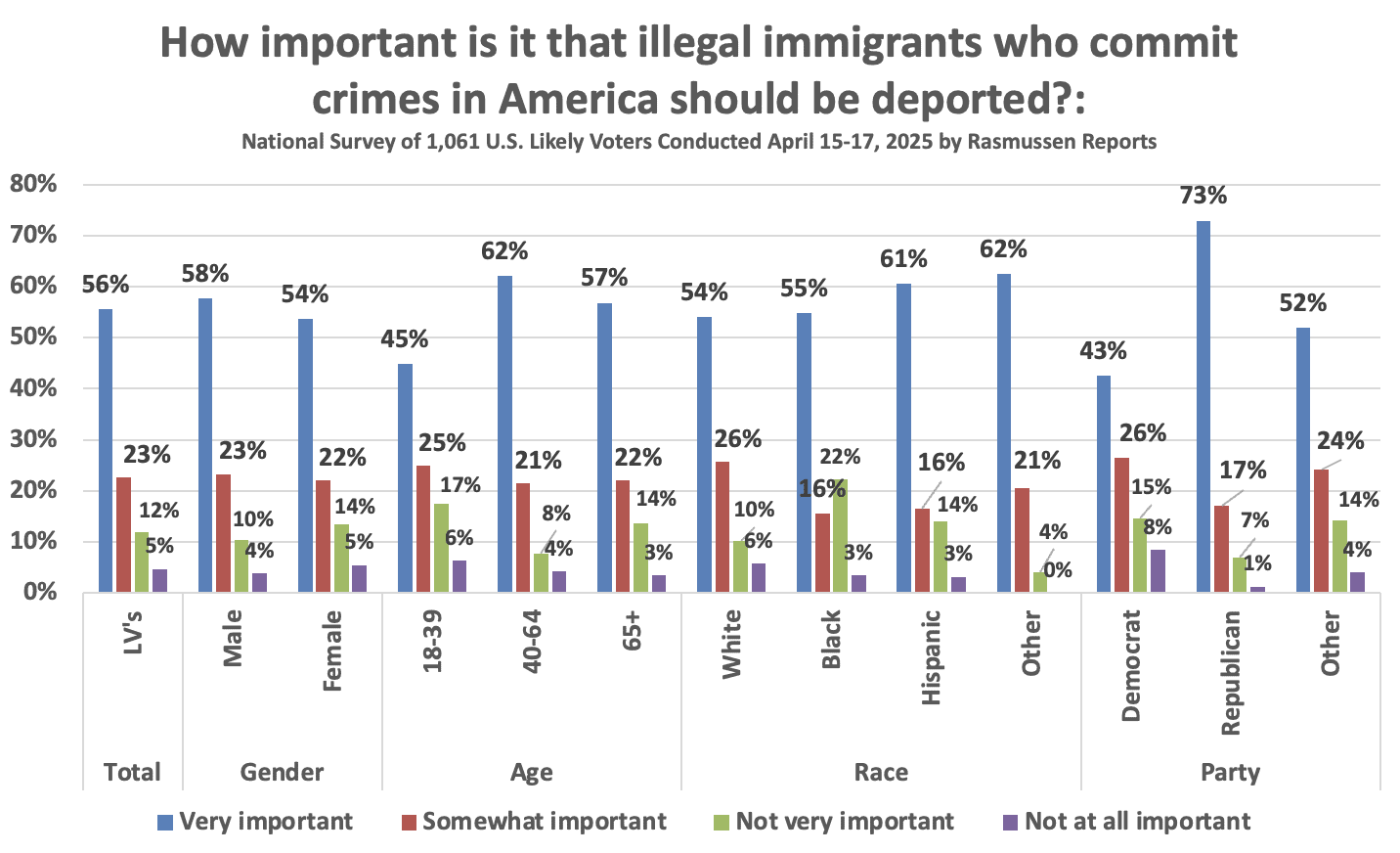 Likely Voters are A recent Rasmussen Reports national survey shows that 79% of likely U.S. voters believe the U.S. should deport illegal immigrants who commit crimes, with 56% saying it’s very important. Only 17% say it’s not important, with just 5% saying that it isn’t important at all. Only 32% of Liberals thought that it was very important, followed by 43% for Democrats, and 45% of 18 to 39 year olds.