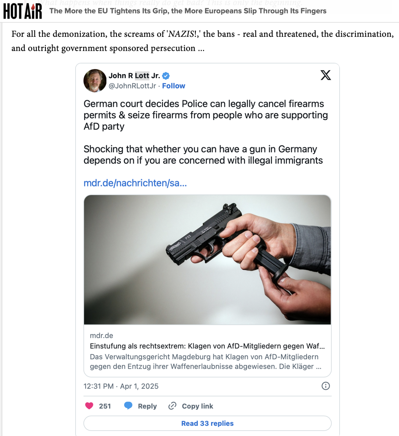 Beege Welborn, “The More the EU Tightens Its Grip, the More Europeans Slip Through Its Fingers,” HotAir, April 7, 2025.