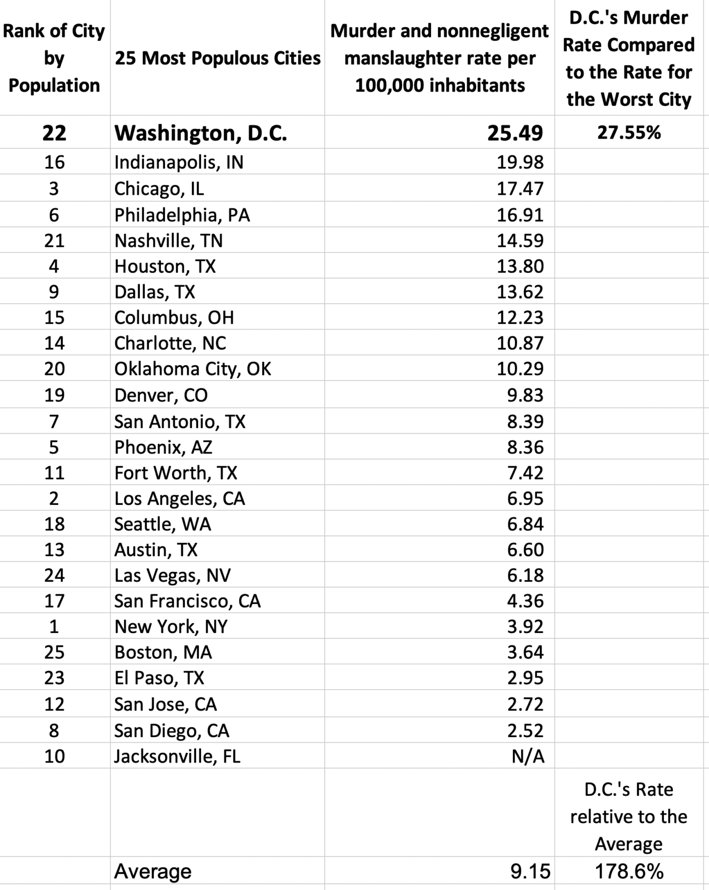 The previous numbers for the states show how D.C. compares to the nation, but the more telling comparison is with other major cities. D.C.’s murder rate far exceeds that of the 25 most populous cities—and D.C. itself ranks 22nd in population. Among those cities, Indianapolis recorded the highest rate at 19.98 murders per 100,000 people. D.C.’s murder rate still comes in 28% higher than Indianapolis, the next worst of the top 25.