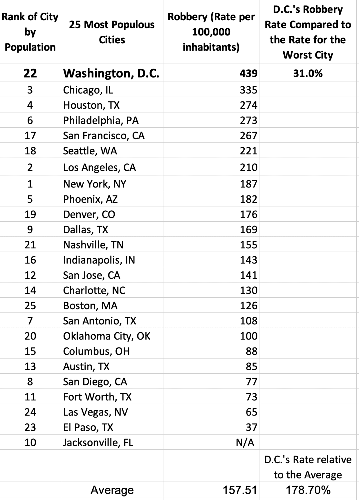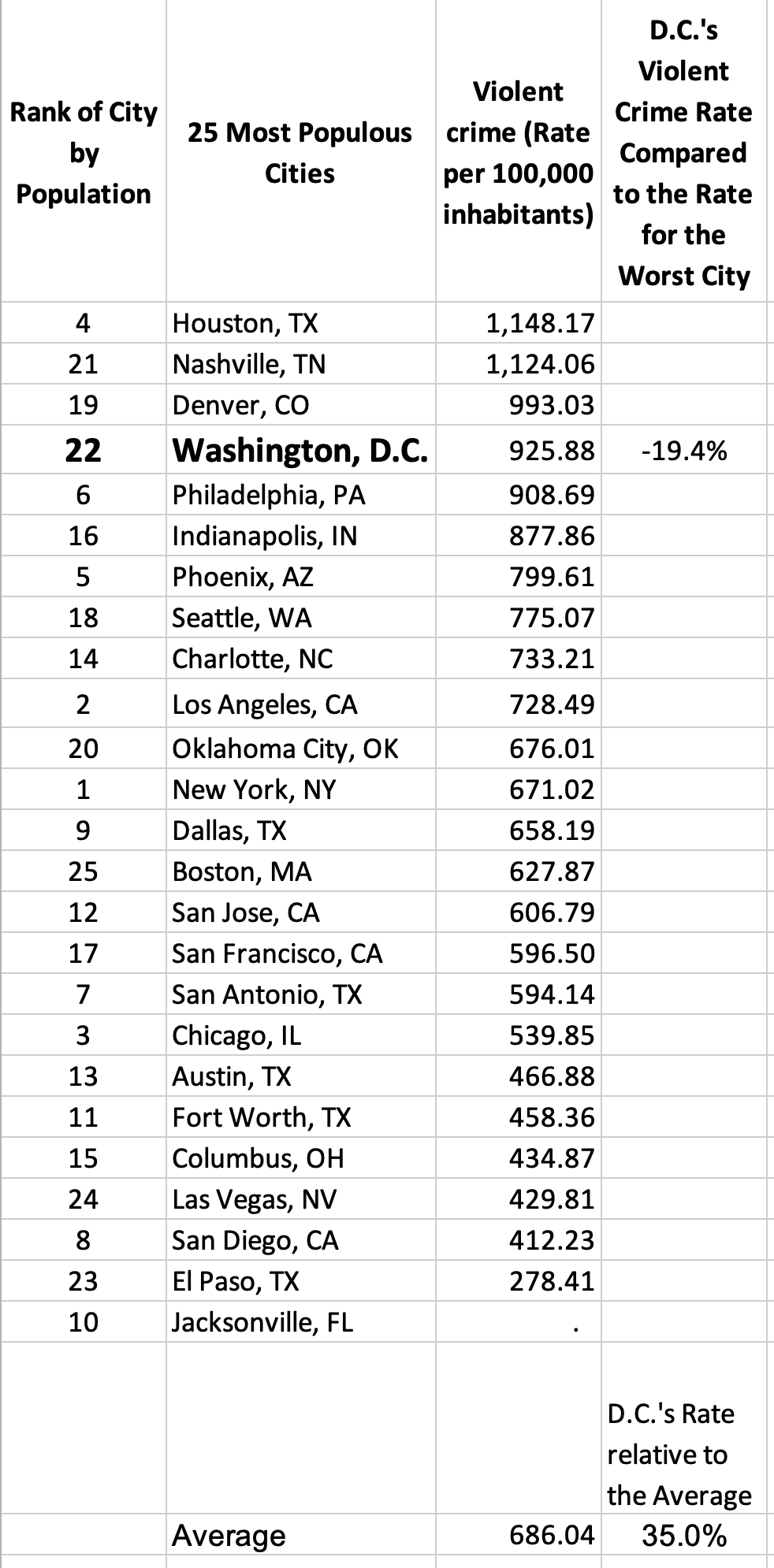Here are comparisons for D.C. to other cities in the 25 most populous cities