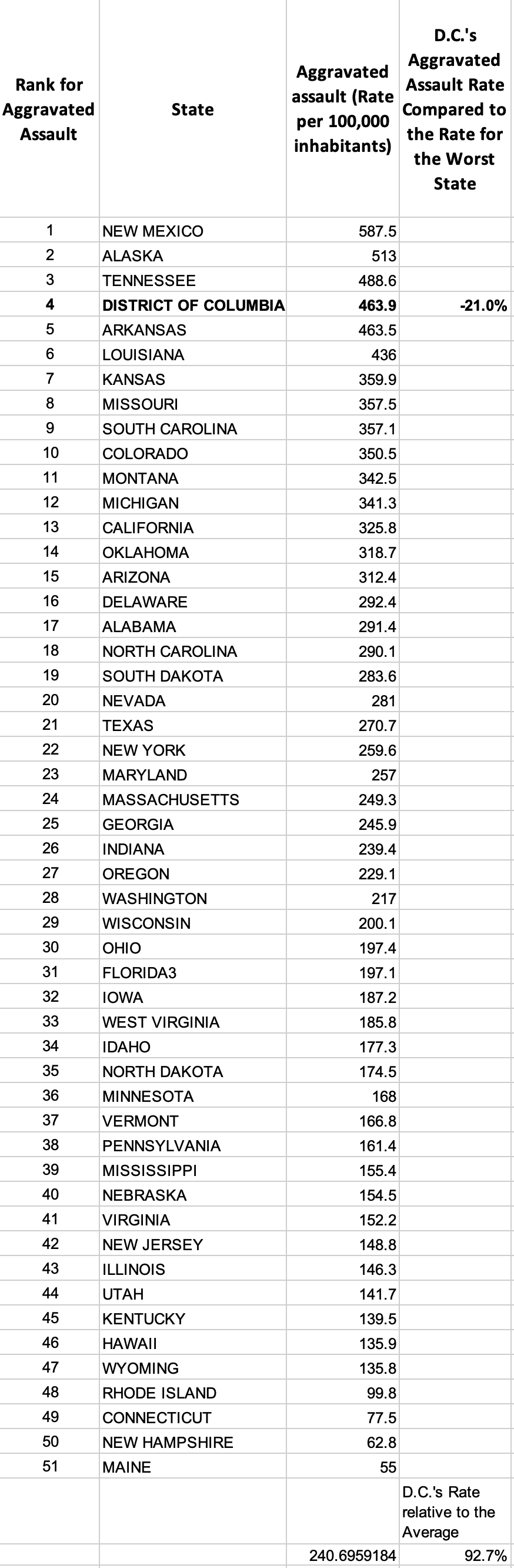 — D.C.’s aggravated assault rate is 21% lower than the highest state, New Mexico. It is 93% higher than the average.