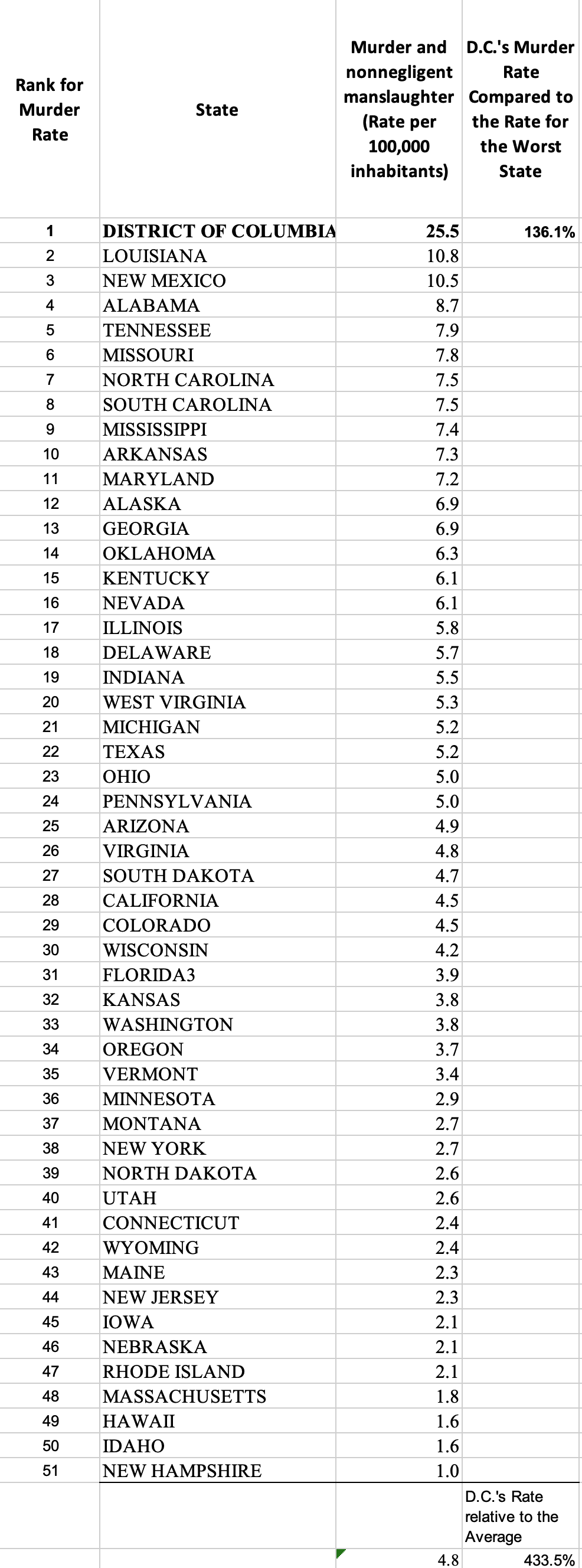 — D.C.’s murder rate is 136% higher than the highest state, Louisiana. It is 434% higher than the average.