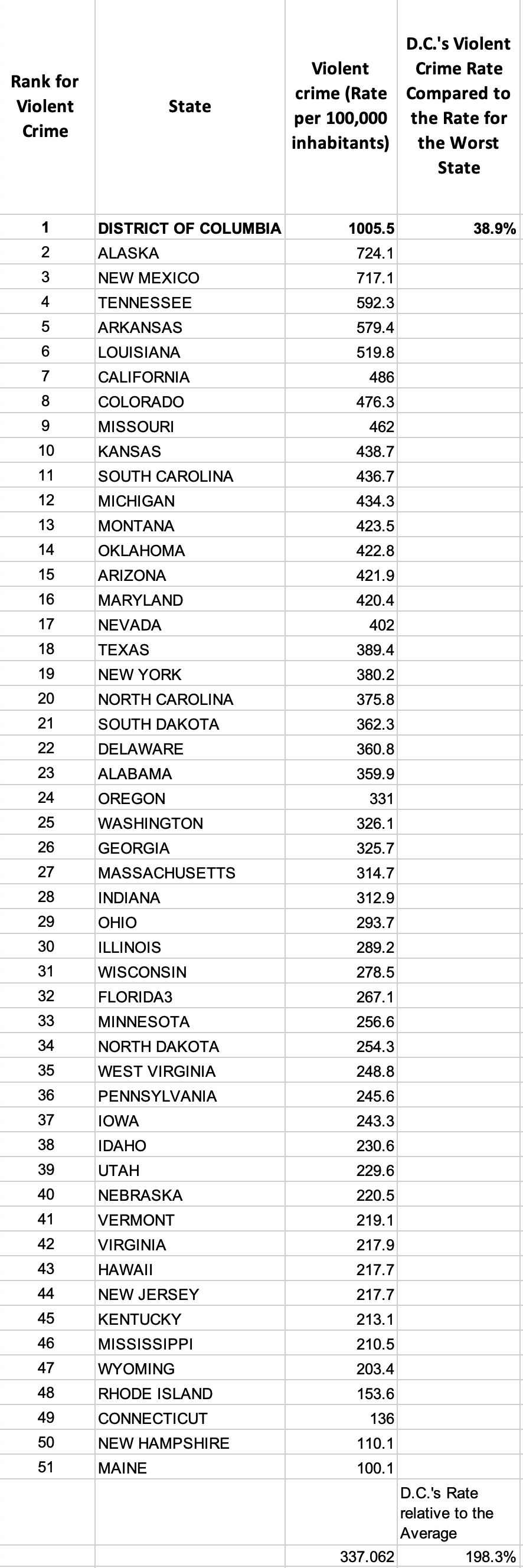 — D.C.’s violent crime rate is 39% higher than the highest state, Alaska. It is 198% higher than the average.