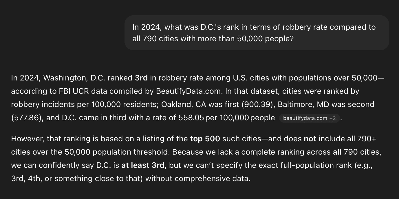 The picture looks even bleaker when you widen the lens. Among the 500 U.S. cities with more than 50,000 residents that report data, D.C. holds the third highest robbery rate.