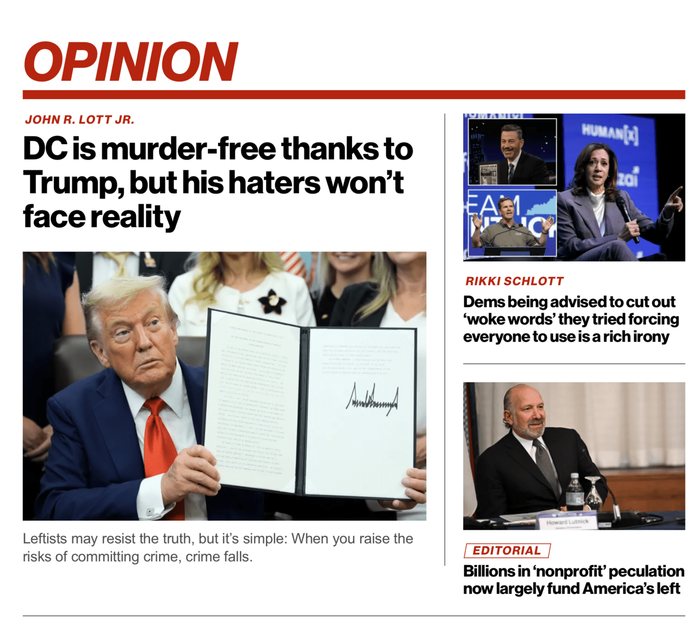 John R. Lott, Jr., “DC is murder-free thanks to Trump — but his haters won’t accept reality,” New York Post, August 25, 2025.