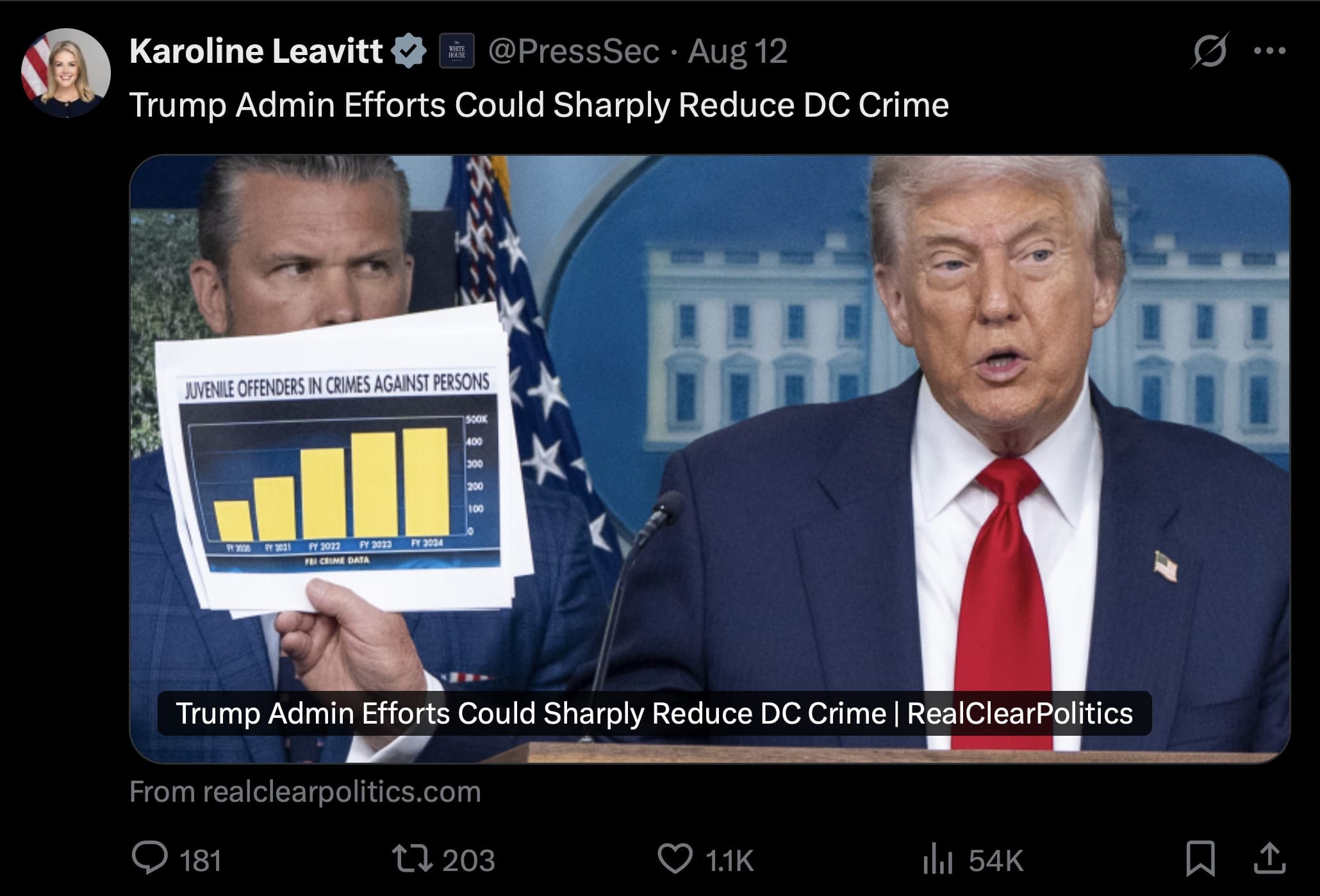 Under the heading “Trump Admin Efforts Could Sharply Reduce DC Crime,” President Donald Trump’s press secretary Karoline Leavitt retweeted one of our opinion pieces on Trump federalizing D.C.’s police force.