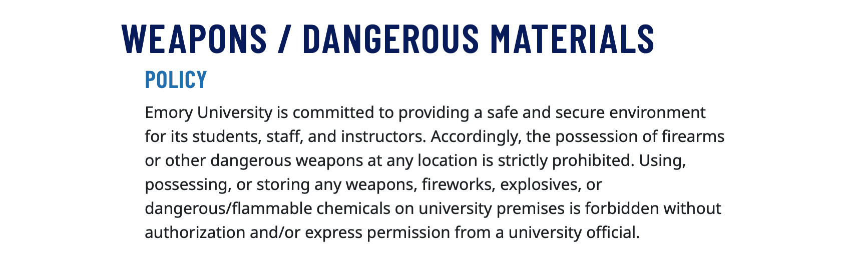 Emory University is committed to providing a safe and secure environment for its students, staff, and instructors. Accordingly, the possession of firearms or other dangerous weapons at any location is strictly prohibited. Using, possessing, or storing any weapons, fireworks, explosives, or dangerous/flammable chemicals on university premises is forbidden without authorization and/or express permission from a university official.