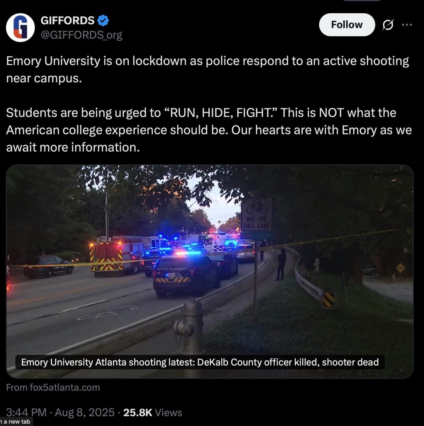 Alexandra Koch, Sophia Compton, and Louis Casiano, “Police officer killed after shooting near CDC headquarters, Emory University in Atlanta,”Fox News, August 8, 2025.