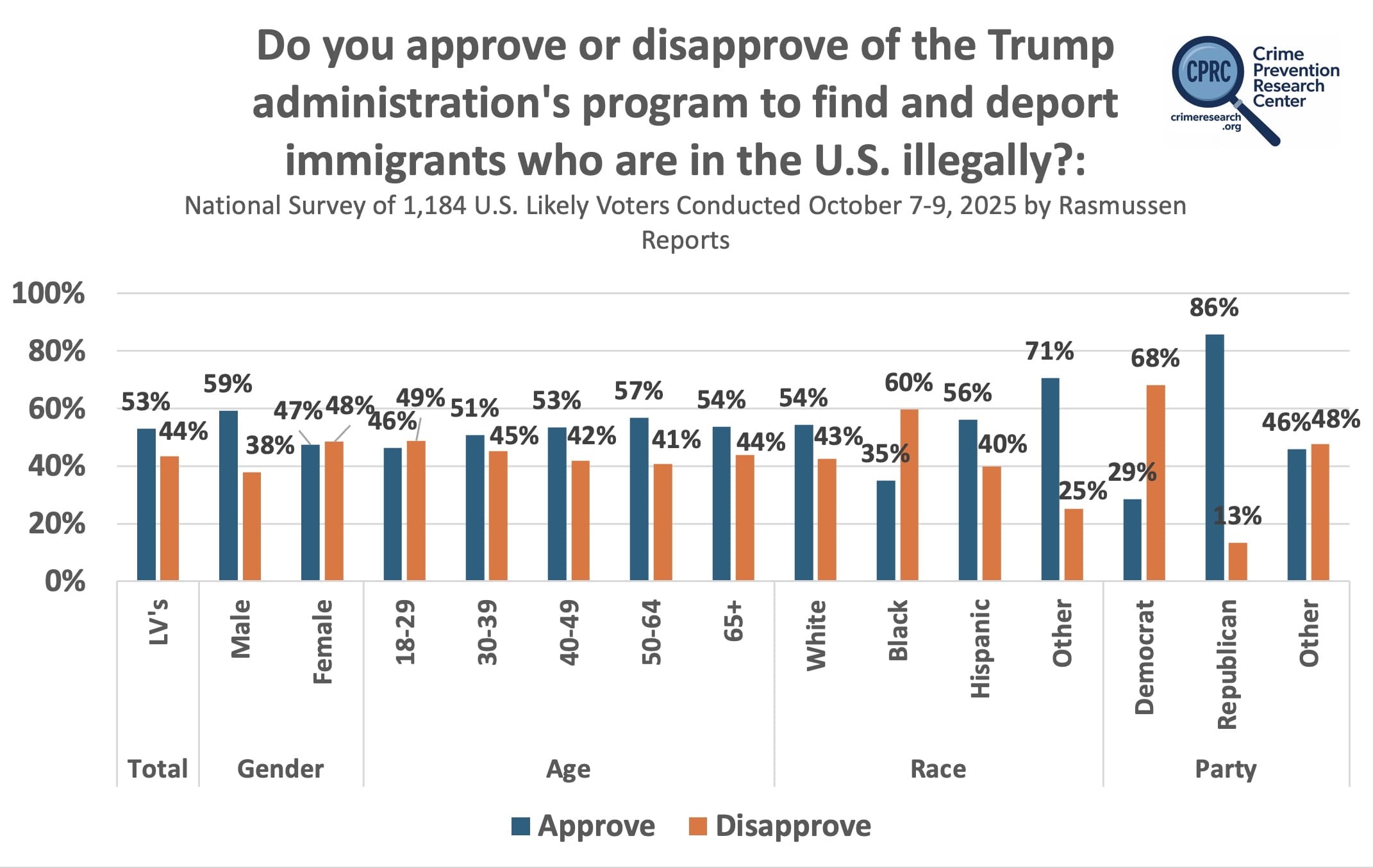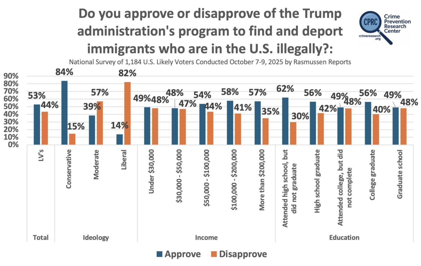 A new Rasmussen Reports national telephone and online survey of 1,184 likely voters on October 7th to 9th finds that 53% of Likely U.S. voters support Trump finding and deporting illegal aliens, including 39% who Strongly Support the president’s policy. Forty-three percent (43%) are opposed, including 29% who Strongly Oppose it. Liberals, Democrats, moderates, and blacks oppose this policy. Among the different education levels, those who went to graduate school are the least supportive while those who didn’t graduate from high school, the people who are likely least skilled, are most supportive removing illegal aliens.