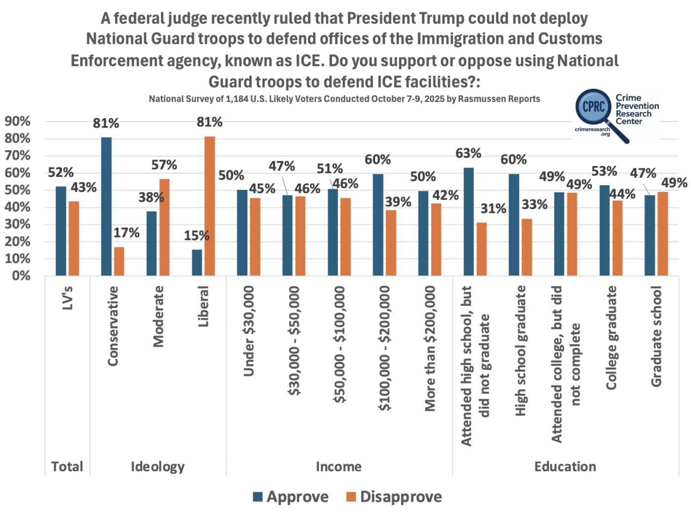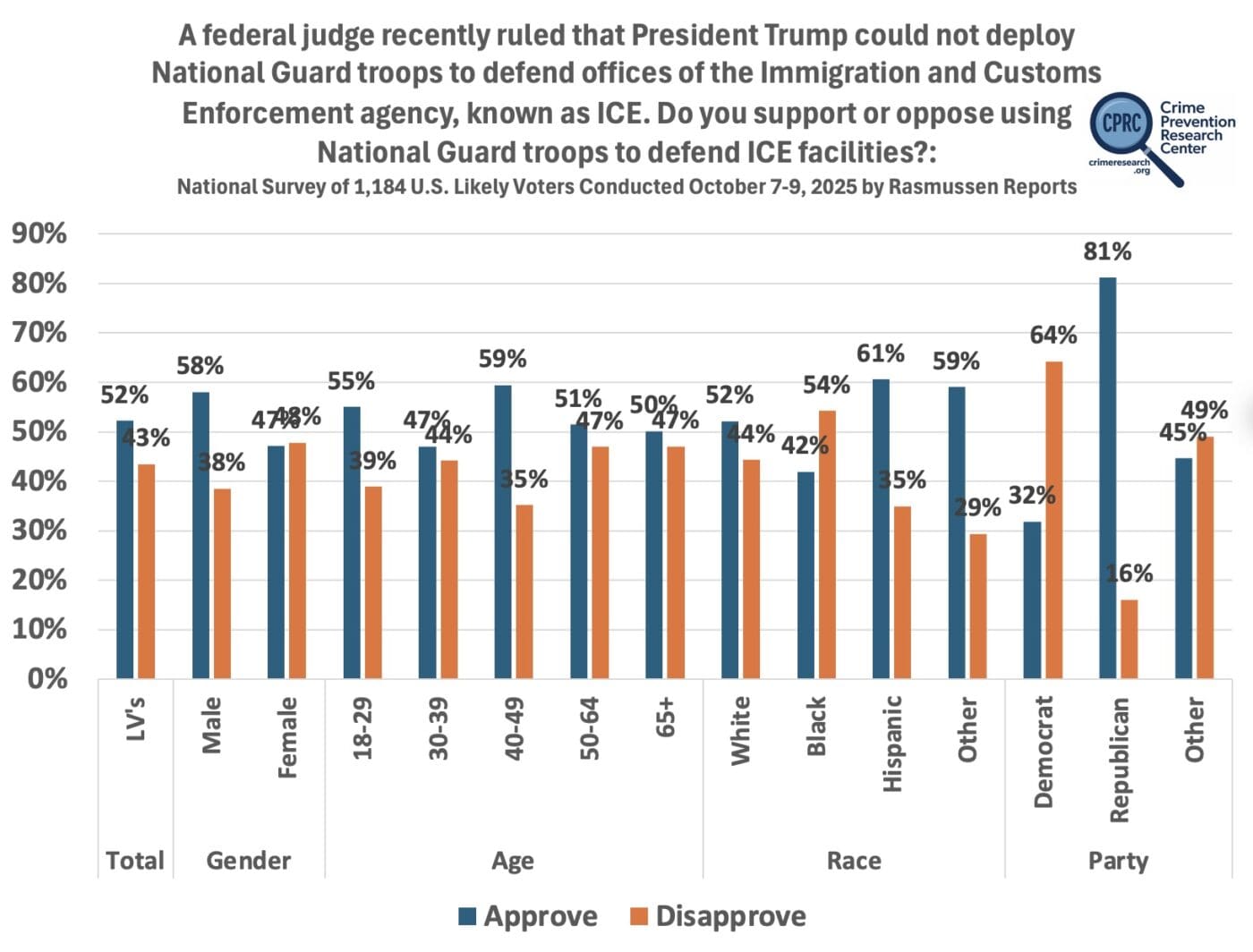 Similarly, 52% of Likely U.S. voters support using National Guard troops to defend ICE facilities, including 39% who Strongly Support the president’s policy. Forty-three percent (43%) are opposed, including 33% who Strongly Oppose deploying troops to defend ICE offices. Liberals, Democrats, moderates, those with a graduate school education, and blacks oppose Trump’s policy. The least educated most strongly support Trump on this.