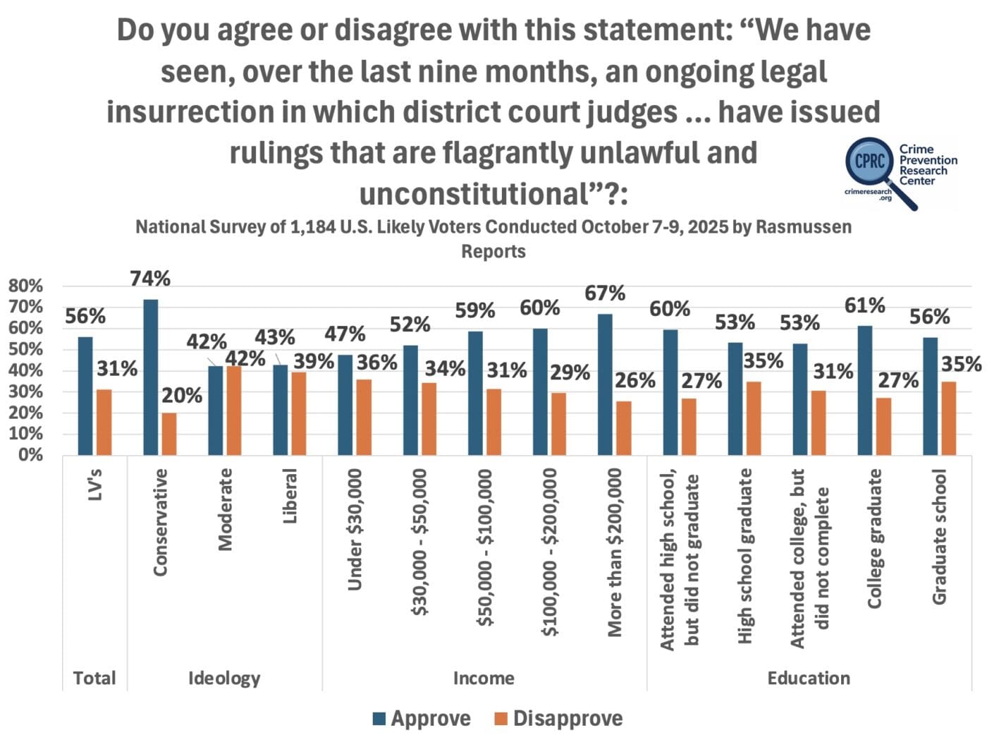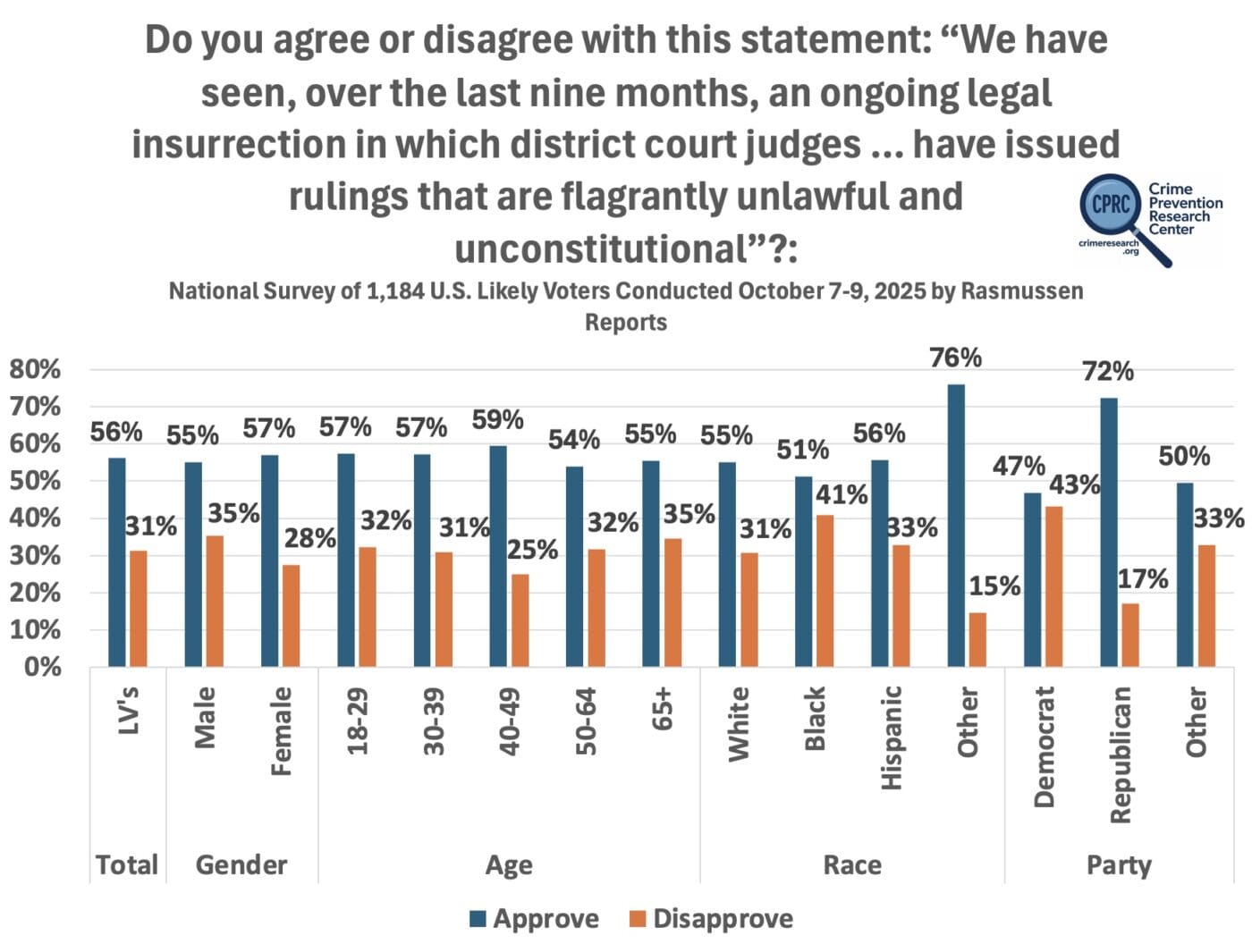 Fifty-six percent (56%) of voters agree with top White House adviser Stephen Miller that: “We have seen, over the last nine months, an ongoing legal insurrection in which district court judges … have issued rulings that are flagrantly unlawful and unconstitutional.” Thirty-eight percent (38%) Strongly Agree, while 31% disagree, of whom 20% who Strongly Disagree. There is no group of voters who clearly disagree with Miller’s statement. The Excel file is available here.