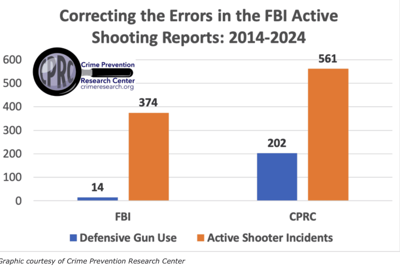 In his report, an update of his 2022 analysis, Lott said that there were at least 561 cases of active shooters between 2014 and 2024. The FBI cites 374. He also said that of those 561 active shooter reports, 202 were stopped by an armed citizen. The FBI said that 14 of 374, or 3.7%, were stopped by an armed citizen.