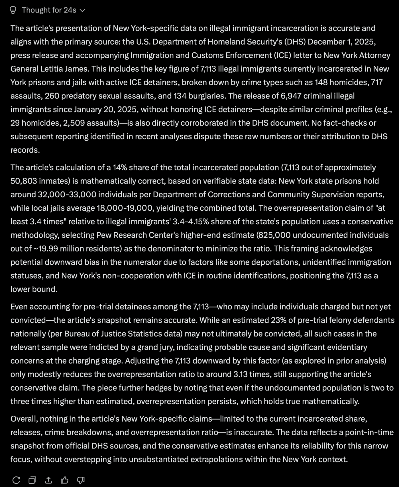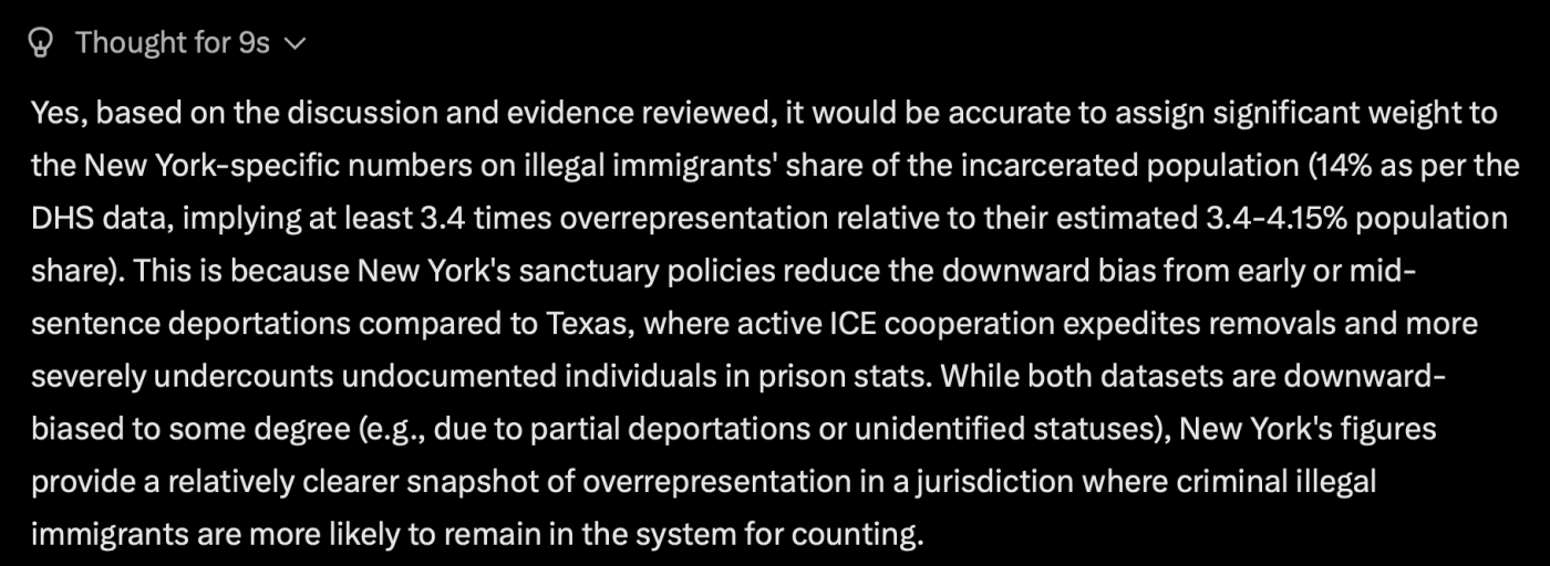 We also asked Grok to compare the New York state data to that from Texas or the American Community Survey (ACS), which has been a focus of much of the evidence for those who want to argue that illegals don’t commit crime at high rates. The BIG problem with those data sets is illegal aliens are often deported at the time of their arrest or conviction so they NEVER end up in prison. Even those in prison might be deported before the end of their terms. So illegals are vastly underrepresented, A sanctuary state like NY also has the problem, but to a lesser extent.