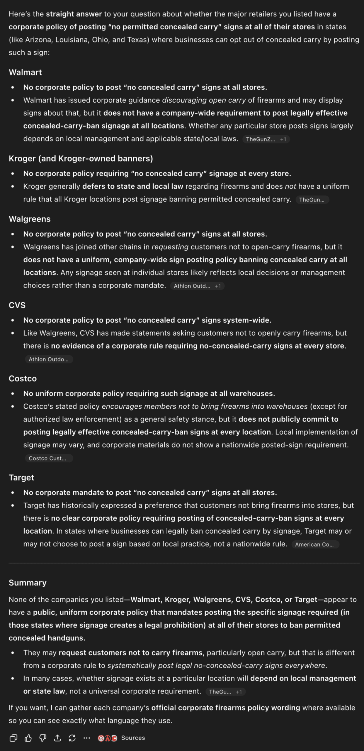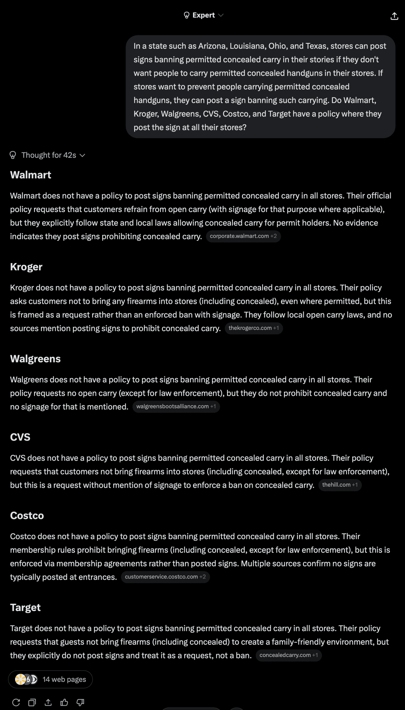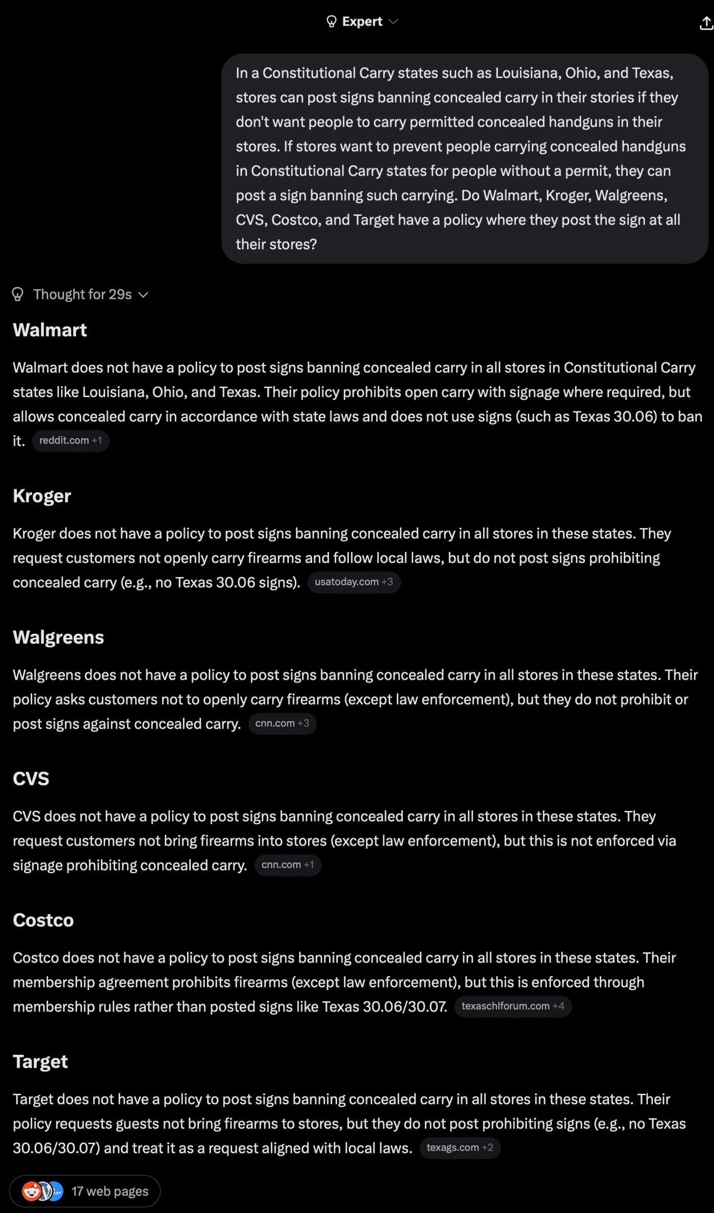 We then asked Grok and ChatGPT the follow answer: “In a state such as Arizona, Louisiana, Ohio, and Texas, stores can post signs banning permitted concealed carry in their stories if they don’t want people to carry permitted concealed handguns in their stores. If stores want to prevent people carrying permitted concealed handguns, they can post a sign banning such carrying. Do Walmart, Kroger, Walgreens, CVS, Costco, and Target have a policy where they post the sign at all their stores?”