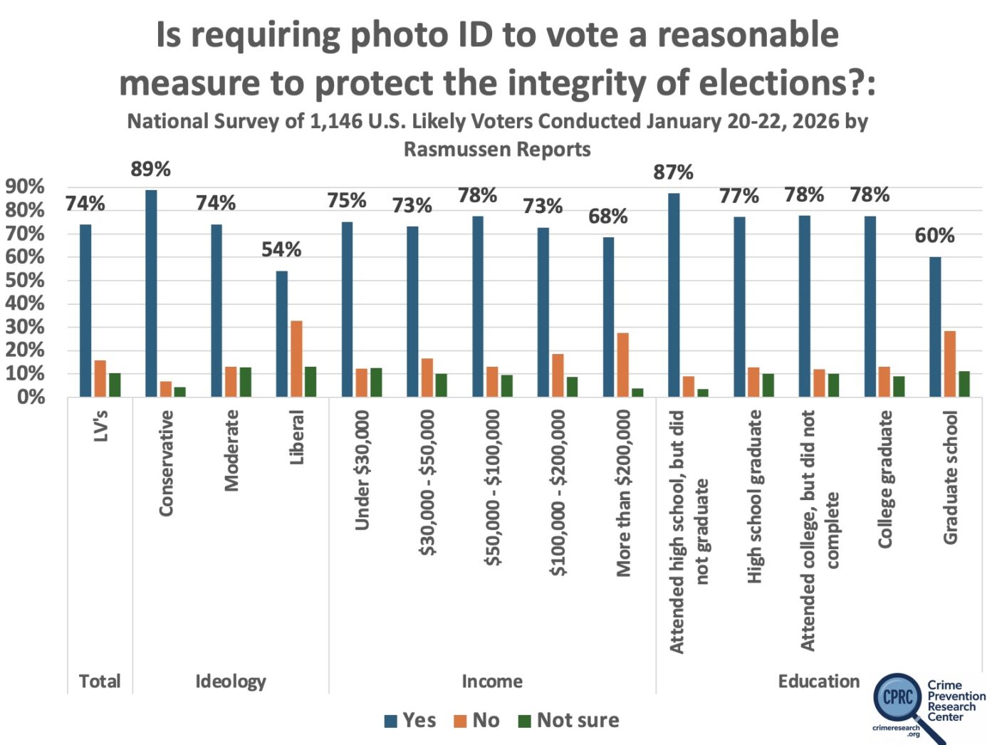 All groups of voters, even Democrats by a 65% to 23% margin and liberals by a 54% to 33% margin, support requiring government issued photo IDs from people to vote. Overall voters support requiring photo IDs by a 74% to 16% margin — a 4.63 times difference. Despite concerns that some people would be unable to vote, and Democrats claim it will be people with low socioeconomic status, those with the least education, those who didn’t even graduate from high school, were the strongest supporters (87% to 9% margin), while those with the most education, having gone to graduate school, were the least supportive (60% to 29% margin). Despite the fact that Democrats claim that minorities (blacks and Hispanics) are the most disenfranchised by requiring IDs to vote, blacks support IDs by a 69% to 14% margin and Hispanics by a 77% to 13% margin (a 64% gap that is even larger than the 58% margin for whites). Men and women are equally supportive of photo voter IDs, with 74% supporting it.