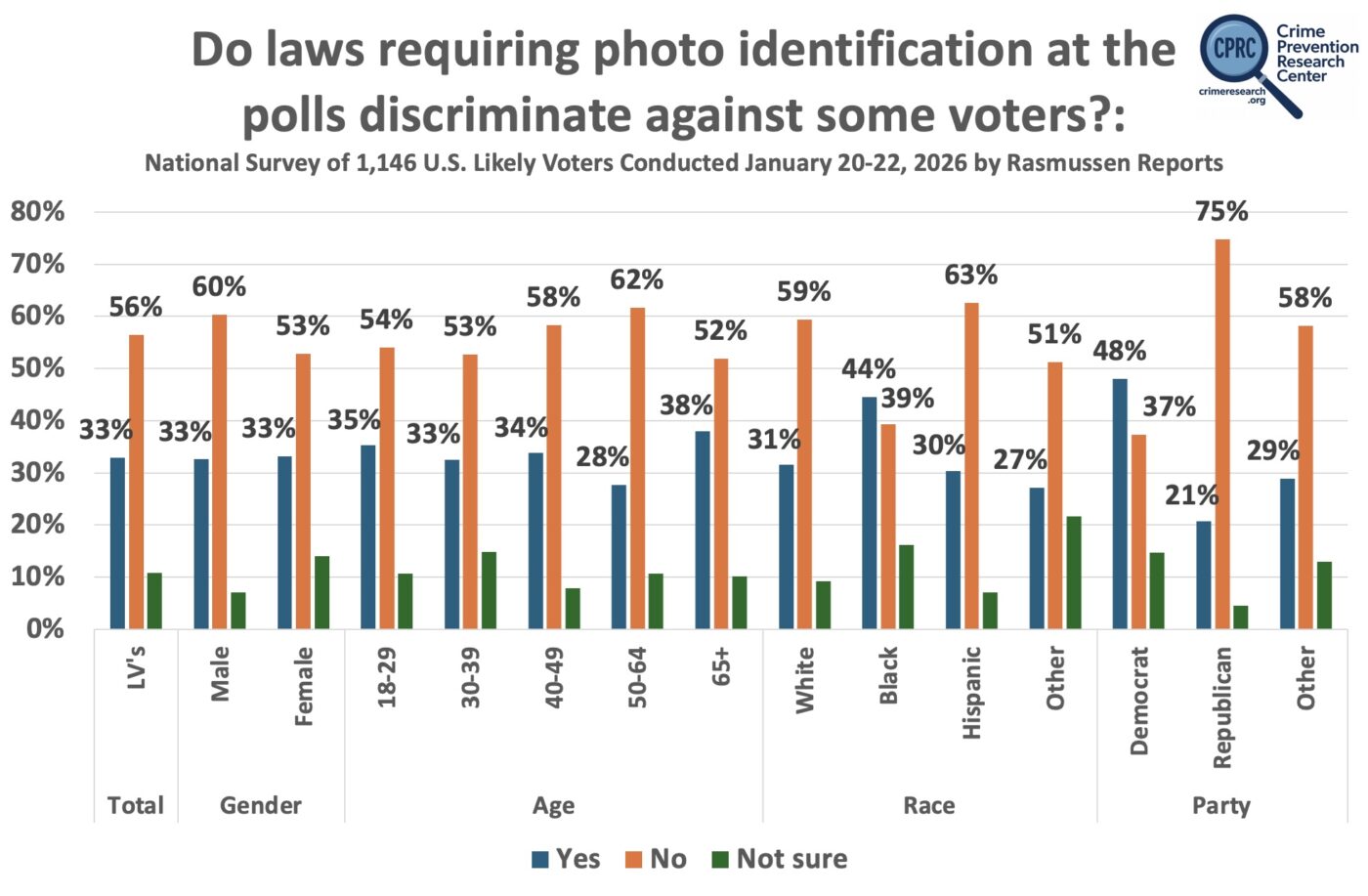 The next question asked by Rasmussen was whether photo ID laws discriminate against some voters, with likely voters saying that they don’t by a 56% to 33% margin. Again, both men and women, all age groups, all income groups, and all educational obtainment levels agree. In this case, blacks, Democrats, liberals, and those with a graduate school education on net think that they do discriminate against some voters, though they still support these IDs.