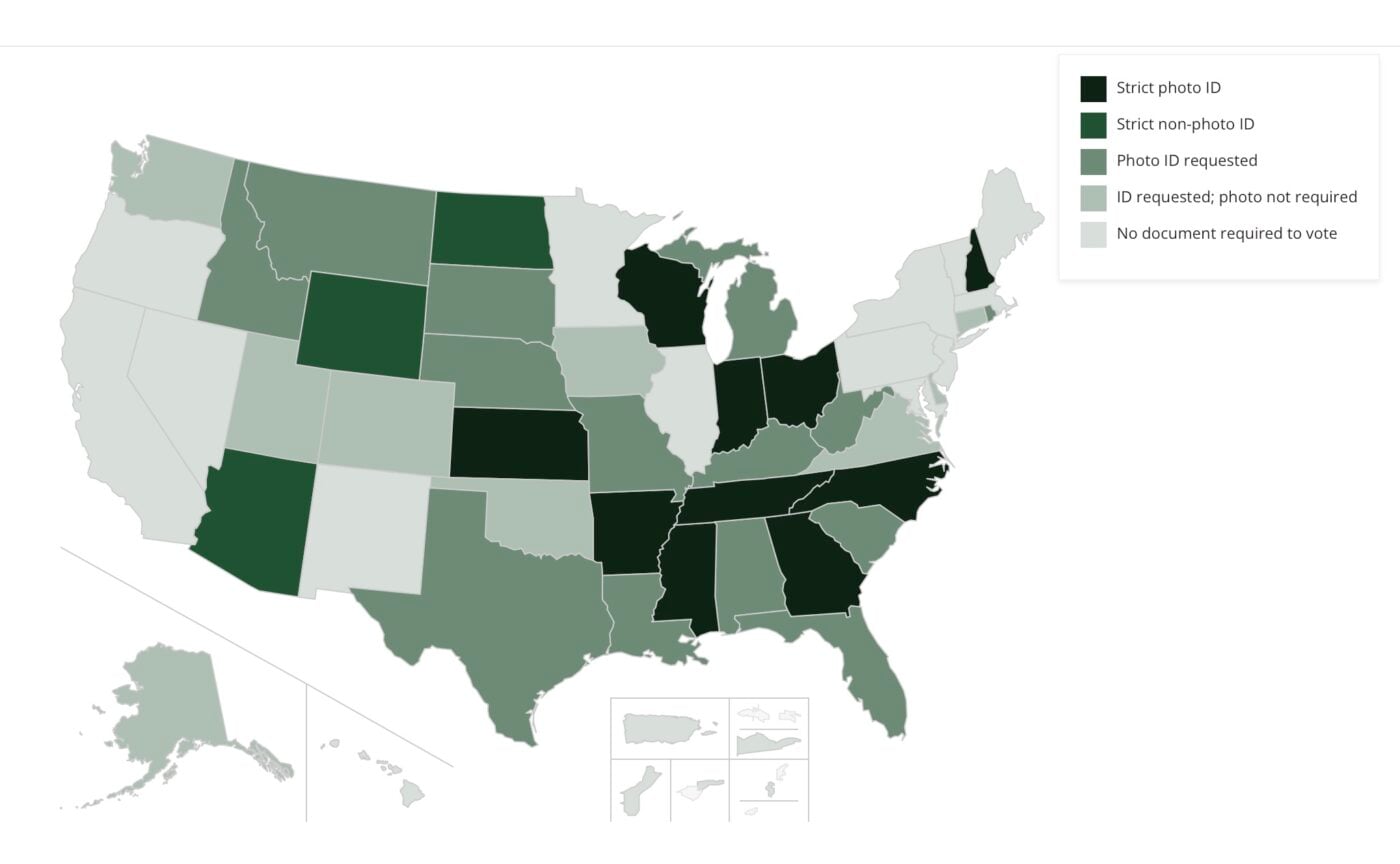The National Conference of State Legislatures collects data on the voter ID requirements across states. Only ten states have “strict” voter ID requirements. Strict photo ID states require voters to affirmatively show acceptable photo identification to cast a regular ballot. If the voter can’t, their provisional ballot generally won’t be counted unless the ID is presented later. In Photo ID requested states voters are asked for a photo IDs, but alternatives are acceptable.
