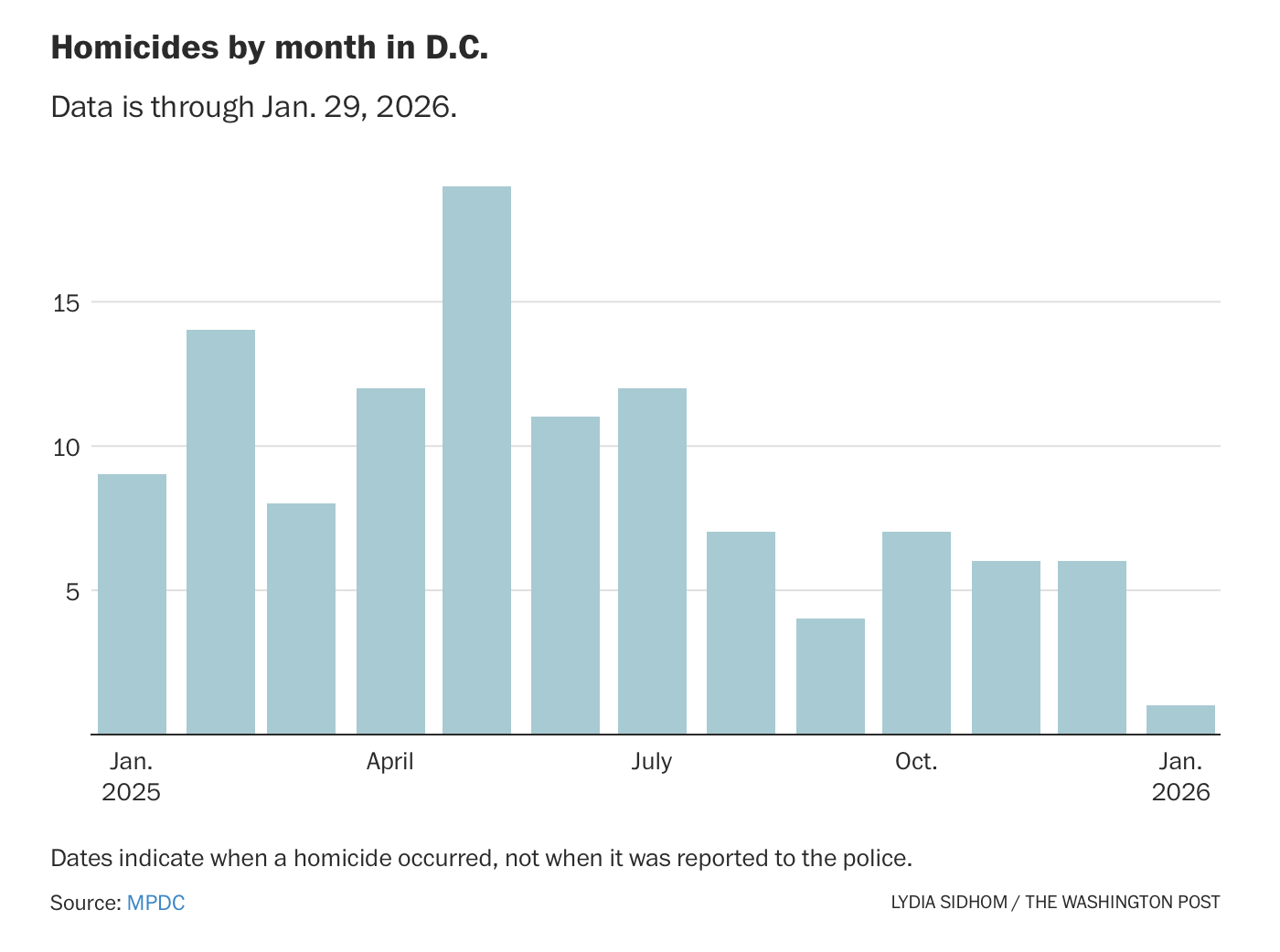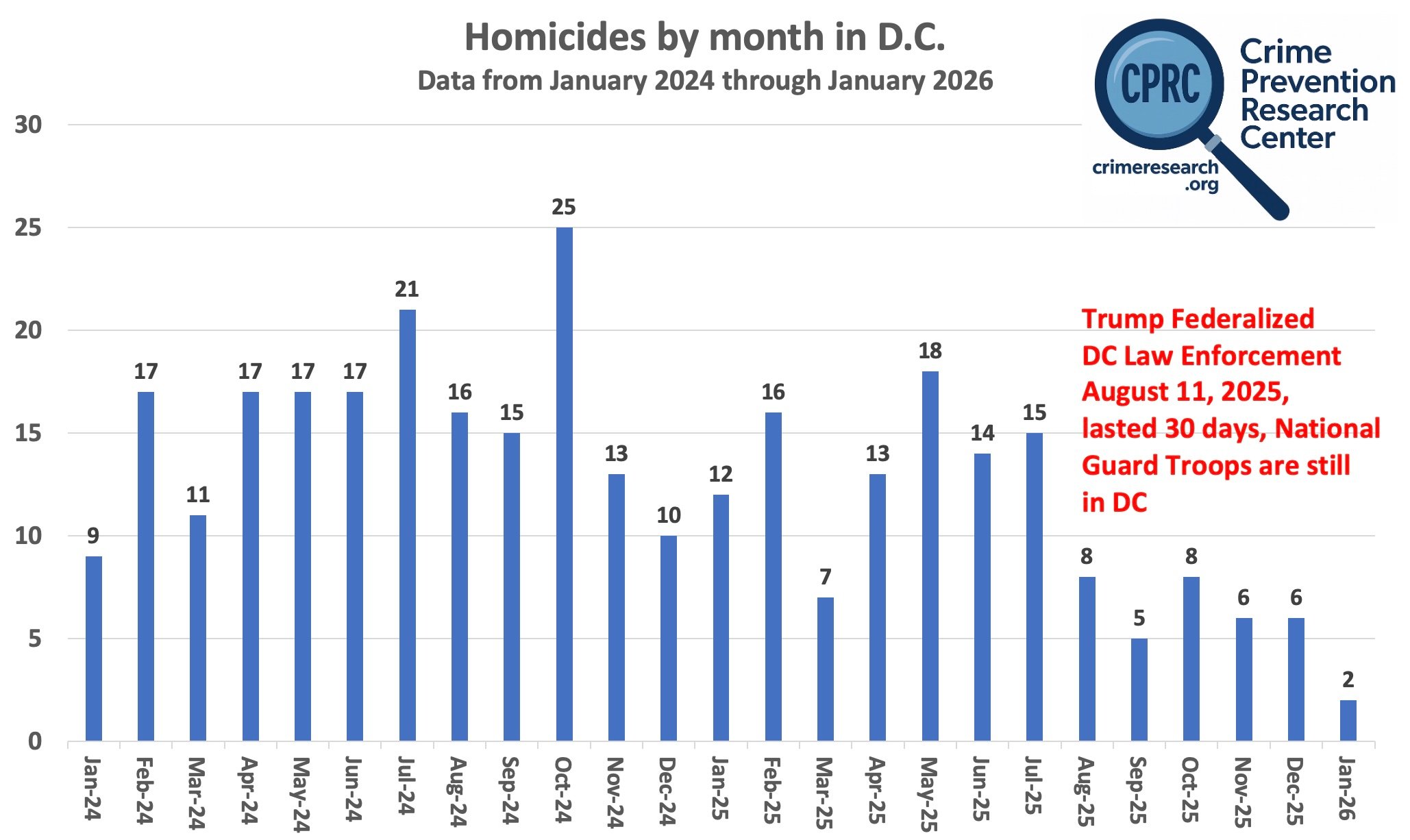 The Washington Post doesn’t really want to give President Trump credit for the drop in crime in DC. Please look at the graph above and notice that there was a discrete change in August and September 2025 (and the change only started about half way through August on the 11th). One important point is the homicide counts from CrimeDataDC differ from those shown in the Washington Post. For example, CrimeDataDC reports 14 homicides in June 2025 and 15 in July 2025, while the Post appears to show figures of 11 and 12, so they have done that to minimize the drop in August. Please check the data yourself.