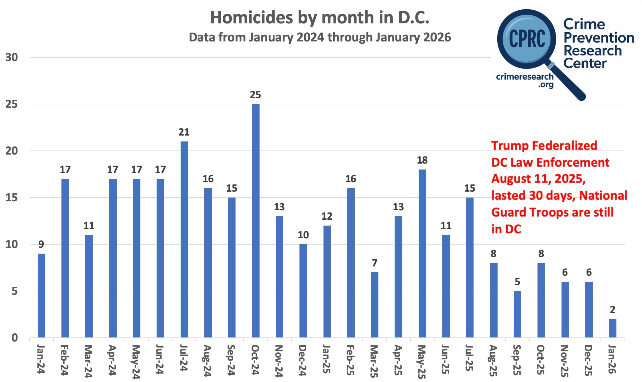 The Washington Post doesn’t really want to give President Trump credit for the drop in crime in DC. Please look at the graph above and notice that there was a discrete change in August and September 2025 (and the change only started about half way through August on the 11th). One important point is the homicide count from DC Crime Cards from the DC police department differs from those shown in the Washington Post. For example, CrimeDataDC reports 15 in July 2025, while the Post appears to show figure 12, so they have done that to minimize the drop in August. Please check the data yourself.