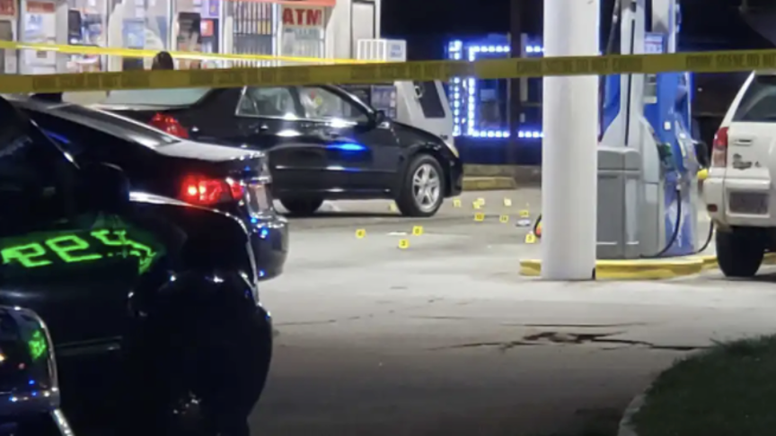 Investigators say more than 50 shots were fired from at least four different weapons. A black car in the gas station lot was left riddled with bullets…